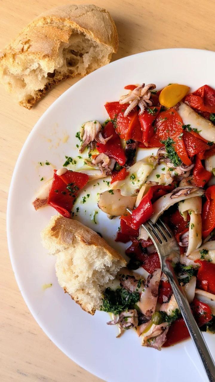 Хороший хлеб Фуэт, чипсы, арахис Французские устрицы с лимоном Помидоры и огурцы с луком Хумус с ростбифом и каперсами Эскаливада (сделаю прямо там) с анчоусами Французские мидии буше на гриле